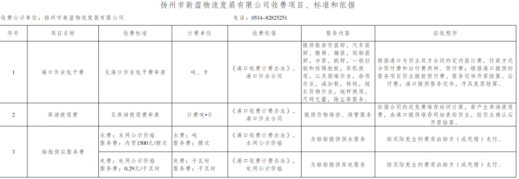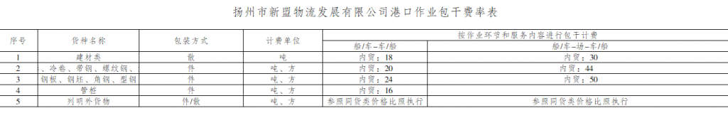 揚州市新盟物流發(fā)展有限公司收費目錄清單公示